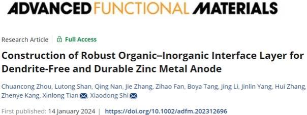 近日,beat365中文官方网站史晓东副研究员所在团队在材料领域Top期刊Advanced Functional Materials (IF=19.0)发表题为《Construction of robust organic-inorganic interface layer for dendrite-free and durable zinc metal anode》的研究论文。beat365中文官方网站周传聪博士、曼彻斯特大学单路通博士为论文共同第一作者,beat365中文官方网站史晓东副研究员、田新龙教授为论文共同通讯作者,beat365中文官方网站beat365中文官方网站为第一通讯单位。