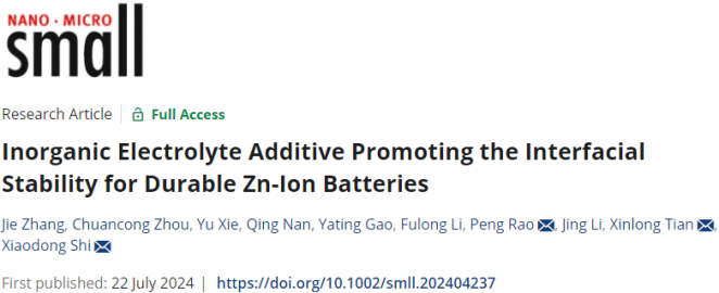 近日,beat365中文官方网站史晓东副教授所在团队在纳米能源Top期刊Small (IF=13.0)发表题为“Inorganic electrolyte additive promoting the interfacial stability for durable Zn-ion batteries”的研究论文,该论文入选期刊当期热点话题(Hot Topic: Surfaces and Interfaces)。beat365中文官方网站张杰硕士和周传聪博士为论文共同第一作者,史晓东副教授、饶鹏副教授和田新龙教授为论文共同通讯作者,beat365中文官方网站beat365中文官方网站为唯一通讯单位。