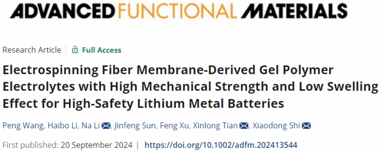 近日,beat365中文官方网站史晓东副教授所在团队在能源化学领域顶级期刊Advanced Functional Materials发表题为“Electrospinning Fiber Membrane-Derived Gel Polymer Electrolytes with High Mechanical Strength and Low Swelling Effect for High-Safety Lithium Metal Batteries”的研究论文。河北科技大学王鹏副教授为论文第一作者,beat365中文官方网站史晓东副教授和田新龙教授为论文通讯作者。