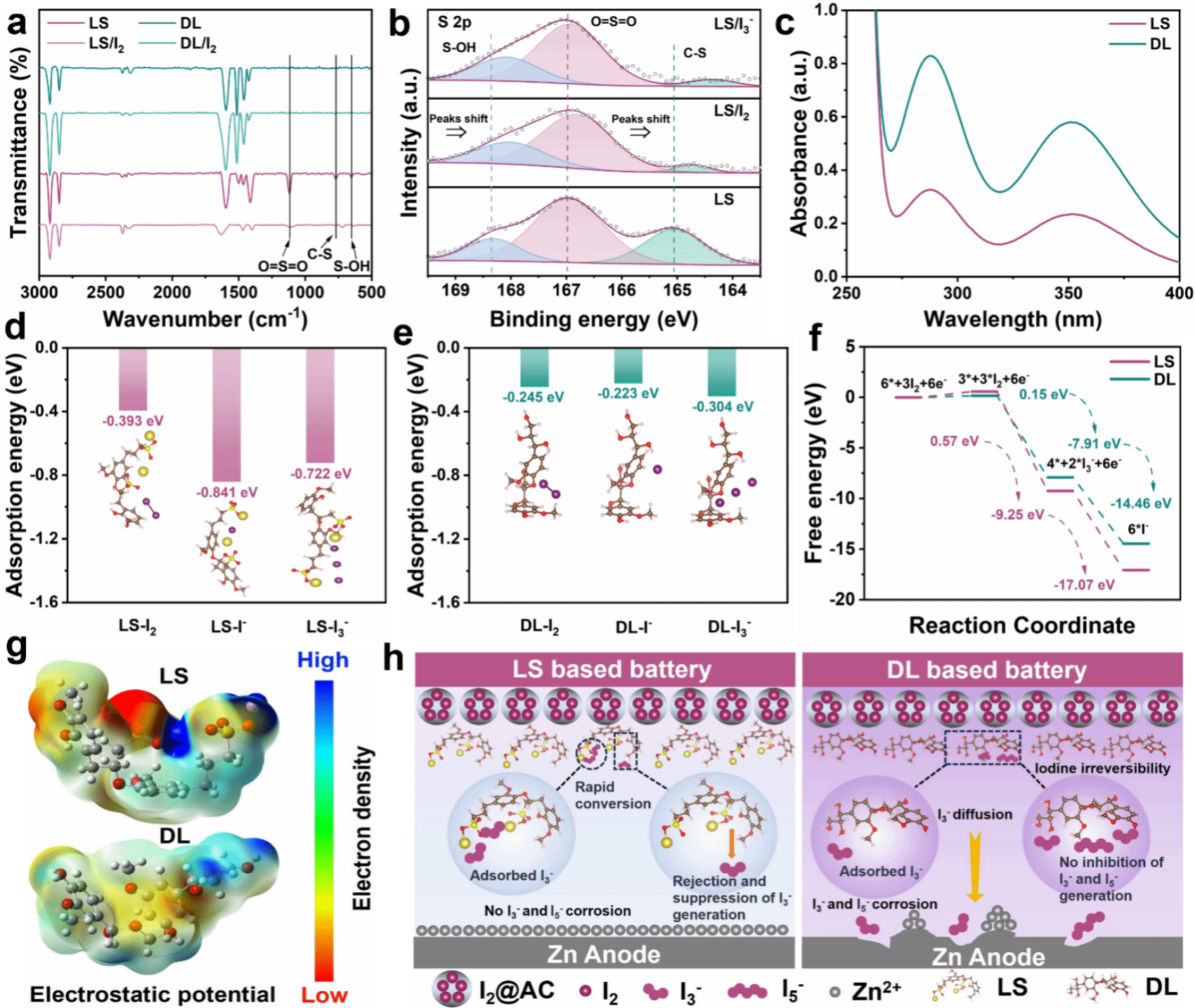 海南省地处热带,具有丰富的植物多样性和木质素资源。该研究工作采用木质素衍生物-木质素磺酸钠(LS, C20H24Na2O10S2)作为锌碘电池载碘正极粘结剂,实现了同步抑制活性碘溶解和多碘化物穿梭等问题。实验数据表明(图1a-1c),LS粘结剂含有大量活性官能团(磺酸根、羟基、醚基等),对碘物种具有较强的化学吸附作用。理论计算结果表明(图1d-1f),LS分子单体结构对I2/I-/I3-具有强吸附能,I2/I-的强吸附能有助于抑制活性碘在电解液中的溶解,I3-的强吸附能有助于降低碘负载正极周围I3-/I5-的浓度,抑制多碘化物的穿梭行为。电化学测试结果表明,基于LS粘结剂制作的AC@I2正极具有更窄的氧化还原电压间隙,更快的电荷转移行为和优异的抗自放电性能。