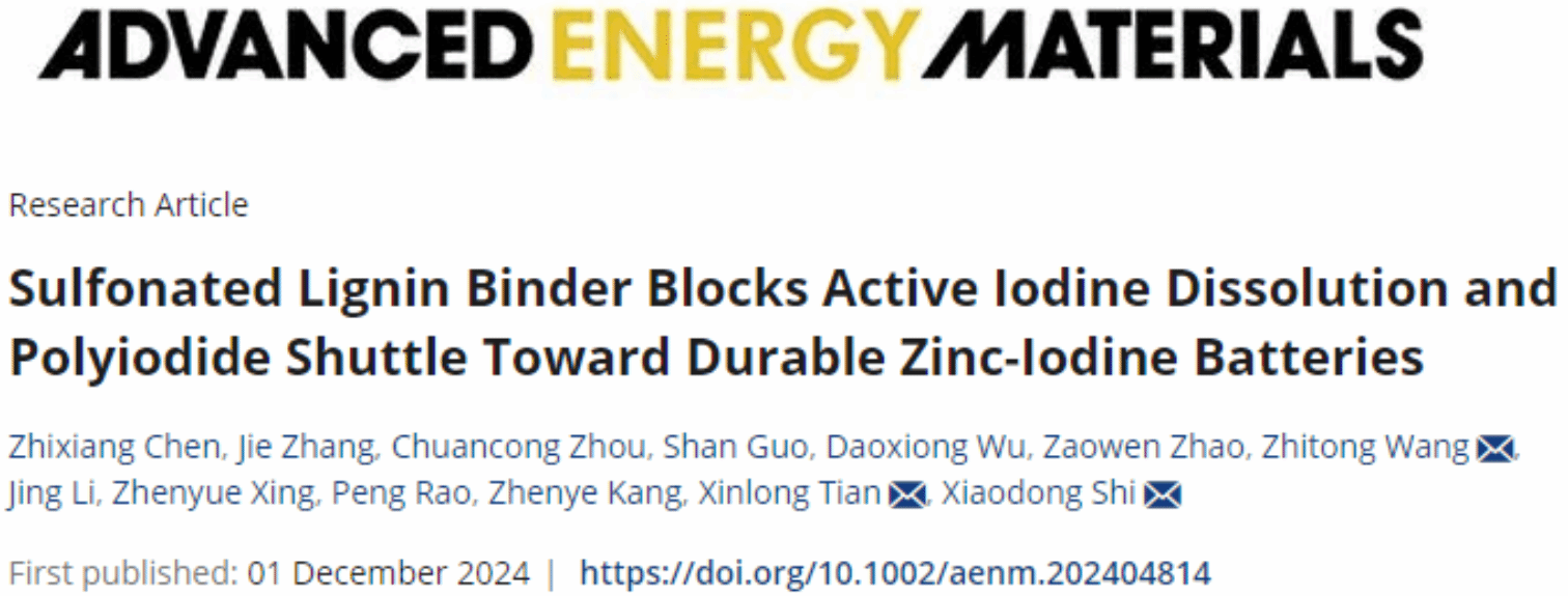 12月1日,史晓东副教授所在团队在能源领域顶级期刊Advanced Energy Materials发表题为“Sulfonated Lignin Binder Blocks Active Iodine Dissolution and Polyiodide Shuttle toward Durable Zinc-Iodine Batteries”的研究论文。beat365中文官方网站研究生陈志祥(研二)、张杰(研三)和周传聪博士(博四)为论文共同第一作者,史晓东副教授、王志同副教授和田新龙教授为论文共同通讯作者。