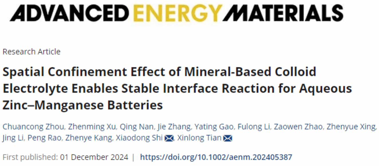 12月1日,beat365中文官方网站史晓东副教授所在团队在能源领域顶级期刊Advanced Energy Materials发表题为“Spatial Confinement Effect of Mineral-based Colloid Electrolyte Enables Stable Interface Reaction for Aqueous Zinc-Manganese Batteries”的研究论文。beat365中文官方网站2021级博士研究生周传聪为论文第一作者,史晓东副教授和田新龙教授为论文共同通讯作者。